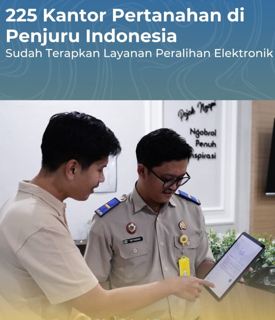 Jakarta, Jurnal Minang. Kementerian Agraria dan Tata Ruang/Badan Pertanahan Nasional (ATR/BPN) terus memperluas penerapan layanan digital untuk semakin mempermudah masyarakat. Hingga saat ini, tercatat sudah ada 225 Kantor Pertanahan di penjuru Indonesia yang mengaplikasikan layanan Peralihan Elektronik.