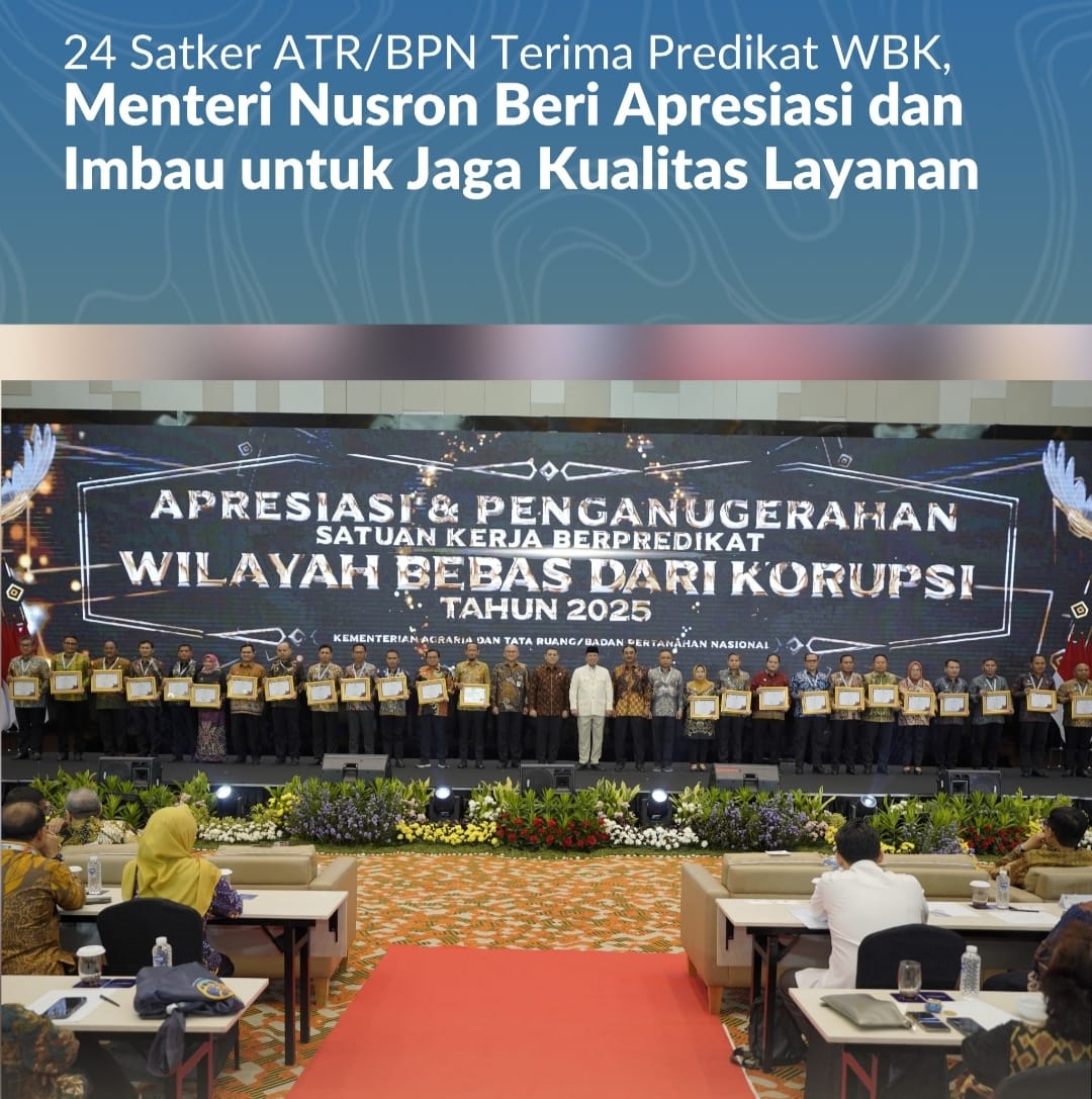 Jakarta, Jurnal Minang. Menteri Agraria dan Tata Ruang/Kepala Badan Pertanahan Nasional (ATR/BPN), Nusron Wahid, menyerahkan 24 penghargaan kepada satuan kerja (Satker) Kementerian ATR/BPN yang berhasil meraih predikat Wilayah Bebas Korupsi (WBK), dalam Rapat Kerja Nasional (Rakernas) Kementerian ATR/BPN, Senin (08/12/2025). WBK merupakan predikat yang diberikan kepada unit kerja instansi pemerintah yang berhasil membangun Zona Integritas, di mana unit kerja tersebut telah berkomitmen untuk mewujudkan birokrasi yang bersih, transparan, akuntabel, dan memberikan pelayanan publik berkualitas tanpa korupsi.
