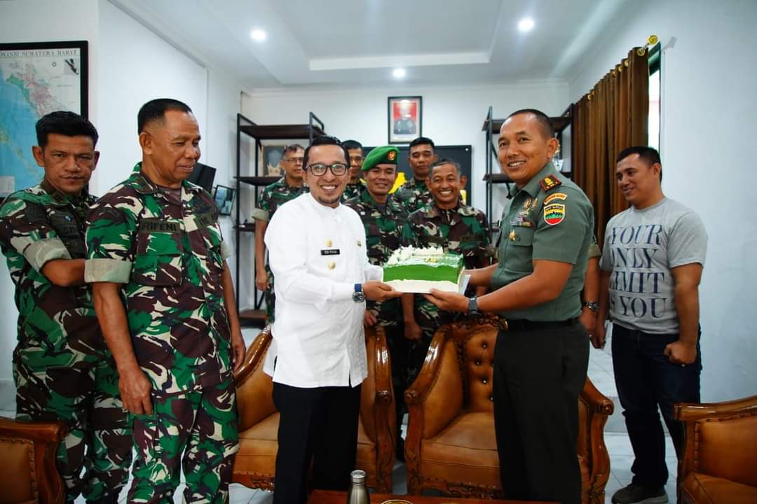 Pemberian ucapan selamat itu ditandai dengan penyerahan kue ulang tahun oleh Bupati Eka Putra yang diterima langsung Dandim 0307 Tanah Datar, Letkol CZI Sutrisno, Jumat (6/10/2023) di Makodim setempat.