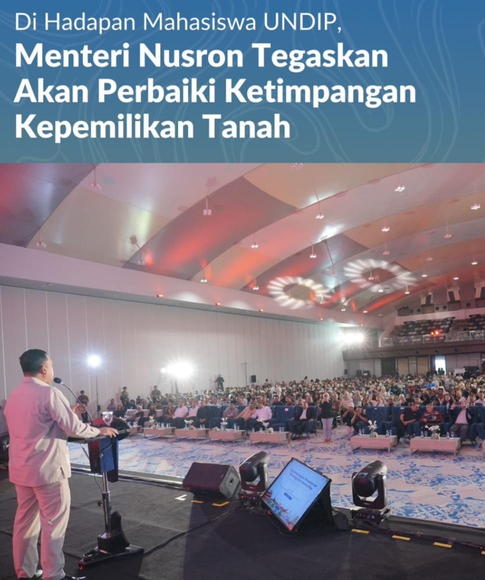 “Di Indonesia ini ada 190 juta hektare tanah. Struktur ketidakadilan kepemilikan tanah menciptakan ketimpangan sosial, menciptakan ketidakadilan di Indonesia. Saat ini, sedang kita perbaiki,” ujar Menteri Nusron saat menjadi pemateri pada acara Indonesia Punya Kamu, yang berlangsung di Universitas Diponegoro (UNDIP), Jawa Tengah, Selasa (02/12/2025)