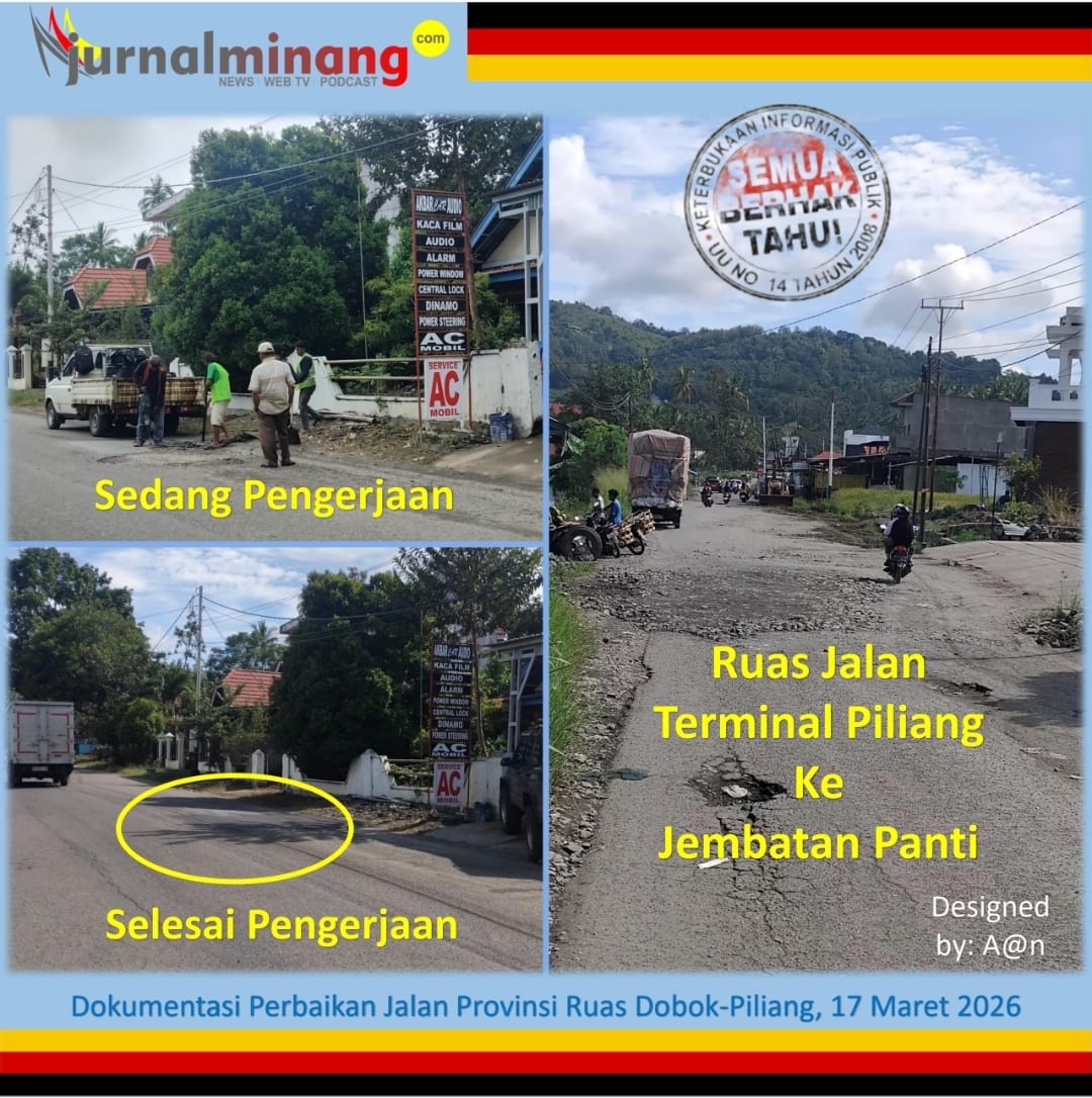 Batusangkar, Jurnal Minang. Dinas PUPR Provinsi Sumatera Barat terlihat mengerahkan timnya untuk melakukan penambalan (patching) jalan ruas Dobok – Piliang dimulai dari simpang Pincuran 7 kearah terminal bus Piliang pada Selasa, 17 Maret 2026.