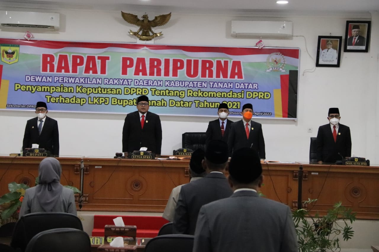 Tanah Datar, Jurnal Minang.com. News&Web TV. Dewan Perwakilan Rakyat Daerah (DPRD) Kabupaten Tanah Datar memberikan rekomendasi terhadap LKPJ Bupati tahun 2021 dalam rapat paripurna dewan setempat, Senin (25/04/22) di Pagaruyung.