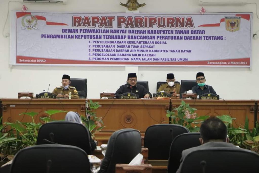 Sidang yang juga dihadiri oleh 26 anggota dewan, Bupati Tanah Datar, Forkopimda, Sekretaris Daerah, Asisten, Staf Ahli Bupati, beserta pimpinan OPD, Pimpinan BUMD dan undangan lainnya mengesahkan lima ranperda menjadi perda itu, yaitu tentang Penyelenggaraan Kesejahteraan Sosial, Perusahaan Daerah Tuah Sepakat, Perusahaan Daerah Air Minum Kabupaten Tanah Datar, Pengelolaan Barang Milik Daerah dan Pedoman Pemberian Nama Jalan Fasilitas Umum.