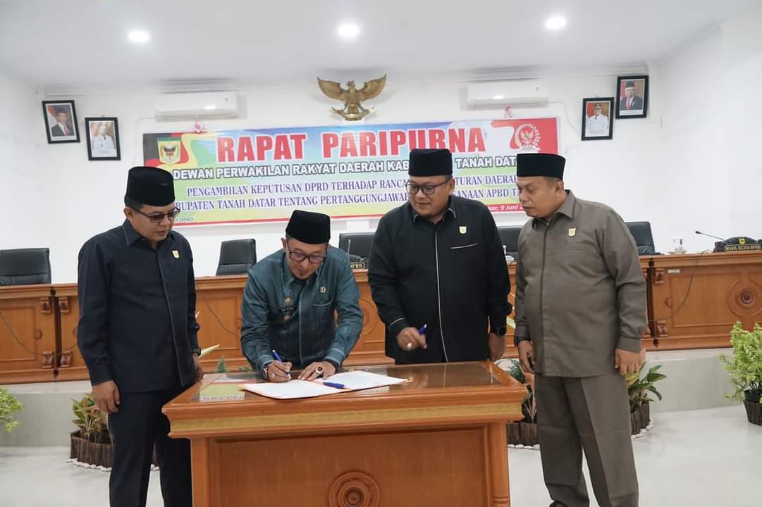 Tanah Datar, Jurnal Minang.com. News&Web TV. Tiga Rancangan Peraturan Daerah (Ranperda) Kabupaten Tanah Datar kembali disetujui menjadi Peraturan Daerah (Perda) dalam Rapat Paripurna Dewan Perwakilan Rakyat Daerah (DPRD) Tanah Datar yang ditandai dengan penandatanganan Surat Keputusan Bersama DPRD dengan Bupati Tanah Datar, Kamis (9/6/2022) di ruang sidang utama DPRD di Pagaruyung.