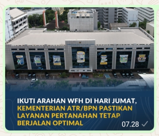Dengan kebijakan WFH setiap Jumat, Kementerian ATR/BPN memastikan seluruh layanan pertanahan, baik secara daring maupun luring, tetap berjalan sesuai standar waktu dan kualitas yang telah ditetapkan. Hal ini sebagai bentuk komitmen mewujudkan tata kelola pemerintahan yang lebih modern dan adaptif. (MW/KR)