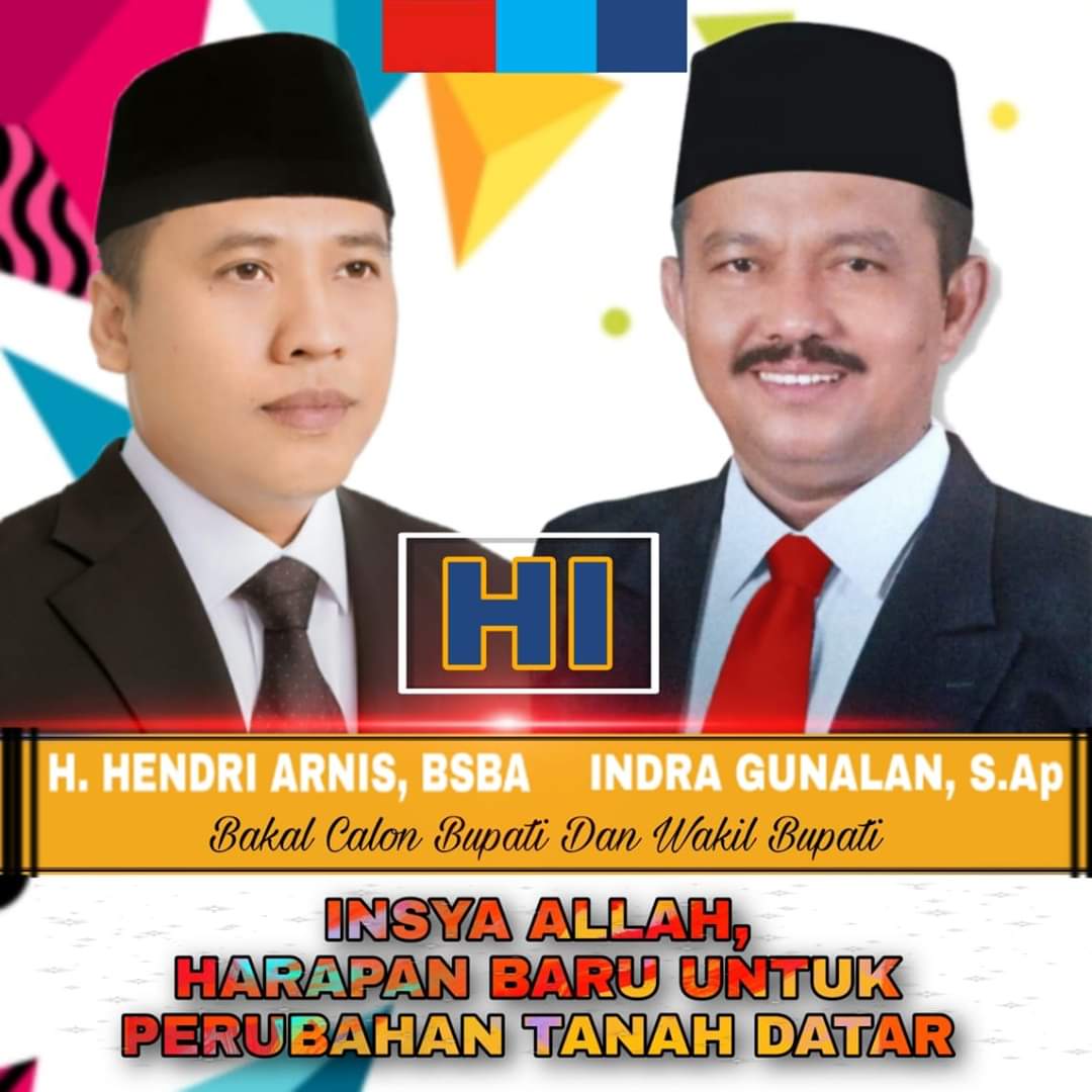 Tanah Datar, Jurnalminang.com. Kemeriahan arena pilkada Tanah Datar semakin bergelora. Hari demi hari muncul berbagai pasangan balonbup. Kemaren muncul antara si A dengan si B, hari ini si A dengan si C. Besok entah siapa lagi. Salah satu yang muncul lagi adalah pasangan Hendri Arnis dengan Indra Gunalan. Foto pasangan ini telah beredar di berbagai media. Kalau ini hanya pekerjaan iseng tentu tidak mungkin dilakukan oleh seorang Hendri Arnis yang sudah berpengalaman sebagai Walikota Padang Panjang dan pernah menjabat Wakil Bupati Tanah Datar. Apalagi Indra Gunalan sebagai seorang pengusaha sukses yang sudah lama bersosialisasi untuk menjadi balonwabup dan sudah dikenal di seantero Luak Nan Tuo.