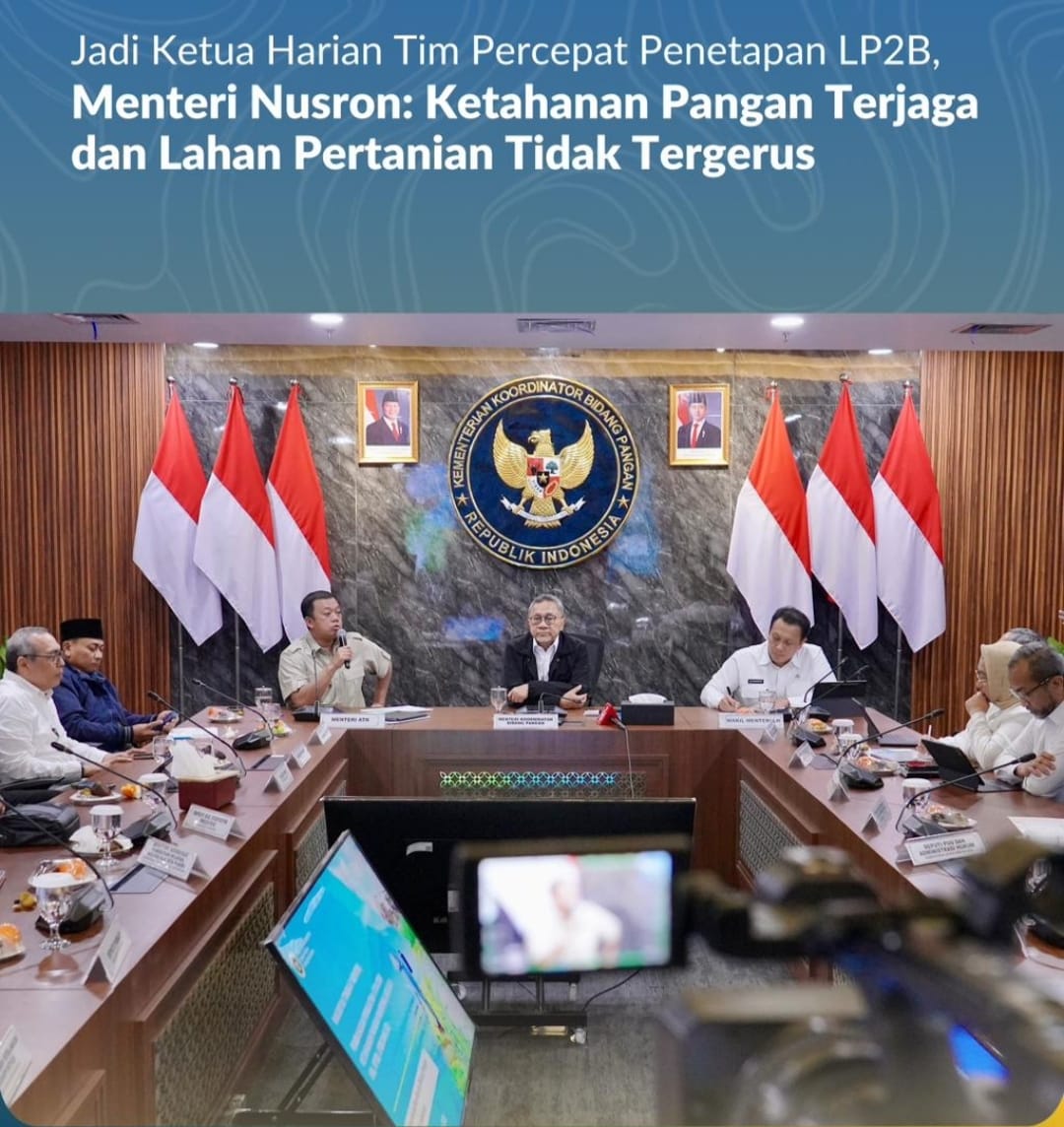 “Rapat ini merupakan langkah percepatan pembentukan tim dan verifikasi penetapan lahan LP2B dan LSD di berbagai provinsi, terutama di 12 provinsi prioritas. Supaya ketahanan pangan dapat tercapai dan lahan pertanian tidak tergerus untuk kepentingan lain,” ujar Menteri ATR/Kepala BPN, Nusron Wahid.