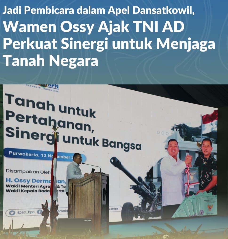 Banyumas, Jurnal Minang. Wakil Menteri Agraria dan Tata Ruang/Wakil Kepala Badan Pertanahan Nasional (Wamen ATR/Waka BPN), Ossy Dermawan, mengajak TNI Angkatan Darat (AD) untuk mengokohkan sinergi dalam menjaga tanah sebagai aset strategis pertahanan dan kedaulatan bangsa. Hal itu ia sampaikan saat mewakili Menteri Nusron menjadi pembicara dalam Apel Komandan Satuan Komando Kewilayahan (Dansatkowil) Terpusat TA 2025, Kamis (13/11/2025).