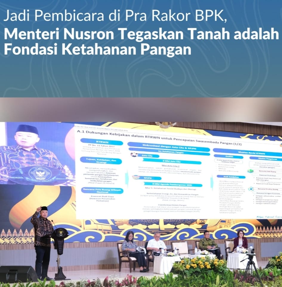Jakarta, Jurnal Minang. Tanah adalah landasan untuk mewujudkan swasembada pangan nasional sesuai dengan Asta Cita Presiden Prabowo Subianto. Hal ini diungkapkan langsung Menteri ATR/Kepala BPN Nusron Wahid saat menjadi narasumber di Pra Rapat Koordinasi (Pra Rakor) Badan Pemeriksa Keuangan (BPK) RI, Jakarta, Selasa (16/07/2025).