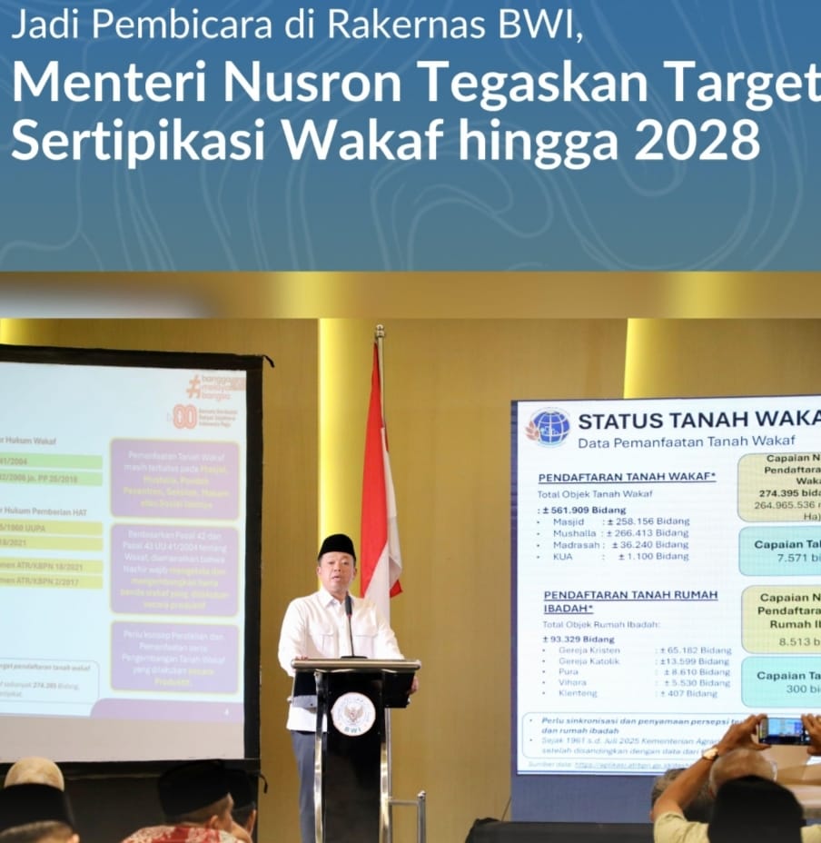 Rakernas BWI menjadi ajang penting bagi Kementerian ATR/BPN dan lembaga wakaf untuk menyamakan langkah dalam program sertipikasi tanah wakaf. Menteri Nusron forum ini menghasilkan kesepakatan dan strategi bersama agar seluruh tanah wakaf di Indonesia dapat tersertipikat sebelum target 2028 tercapai.