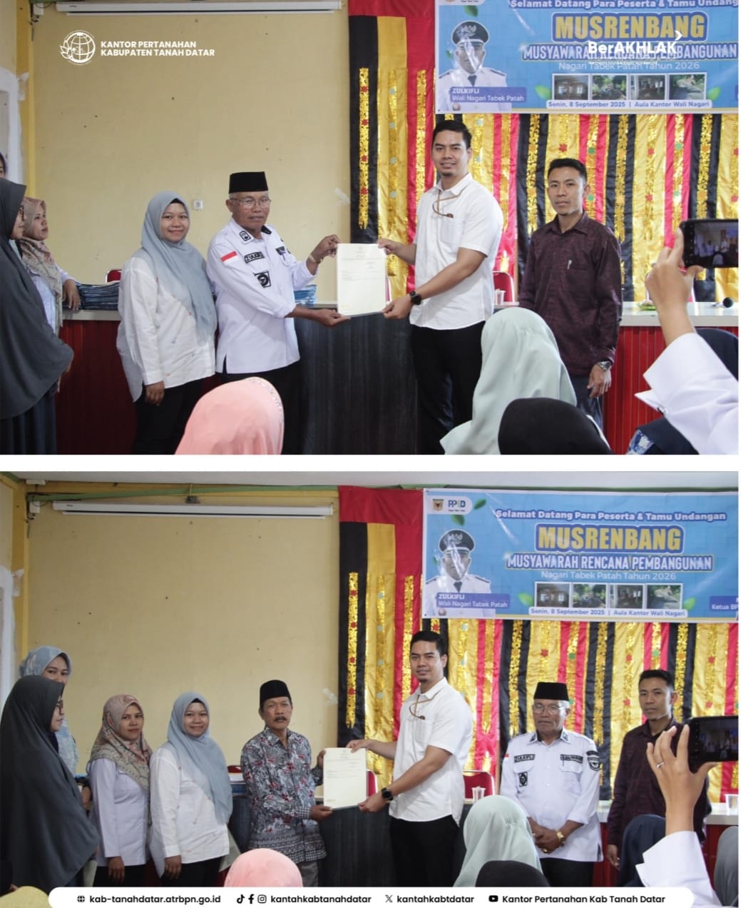 Tanah Datar, Jurnal Minang. Program Pendaftaran Tanah Sistematis Lengkap (PTSL) Tahun 2025 terus memberikan manfaat nyata bagi masyarakat. Pada Selasa, 9 September 2025, Kantor Pertanahan Kabupaten Tanah Datar kembali melaksanakan kegiatan penyerahan sertipikat tanah di Nagari Tabek Patah, Kecamatan Salimpaung.