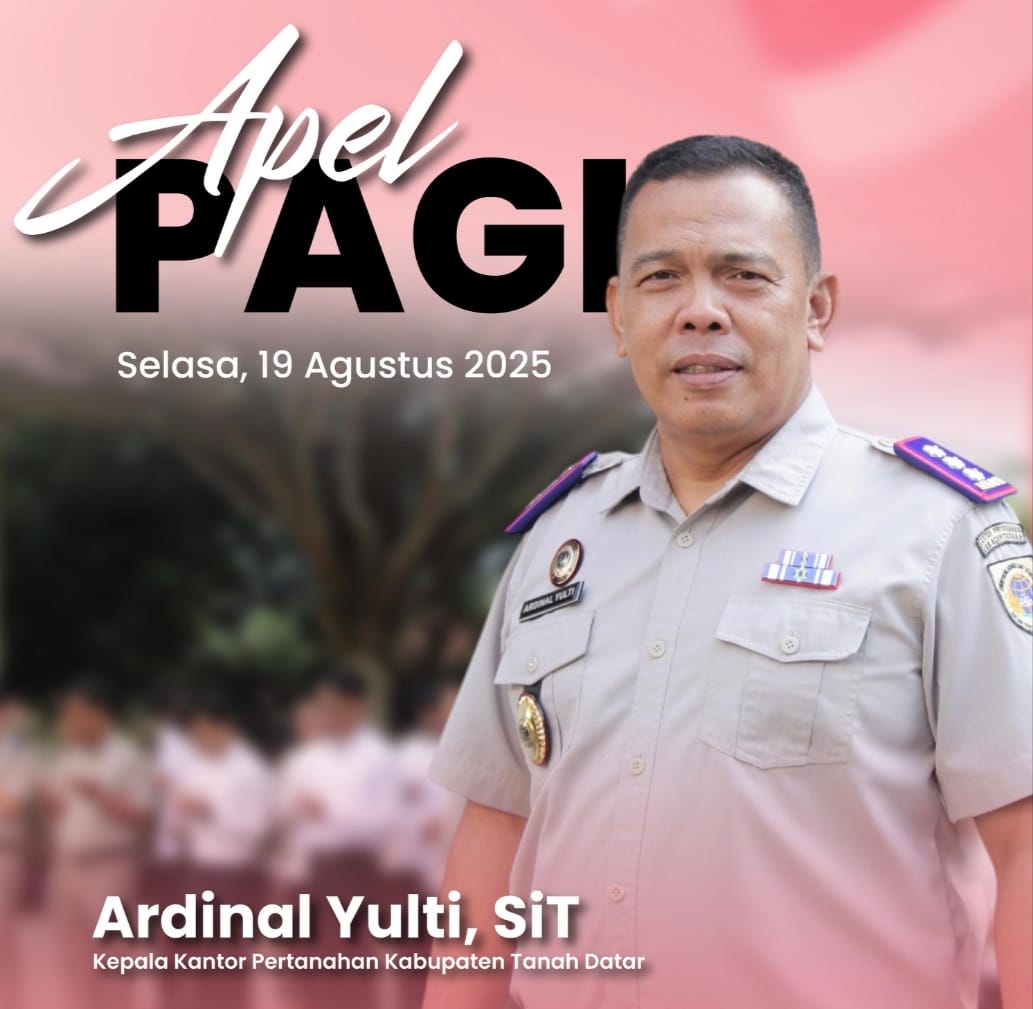 Batusangkar , Jurnal Minang. Kantor Pertanahan Kabupaten Tanah Datar melaksanakan apel pagi rutin pada hari Selasa, 19 Agustus 2025. Apel yang berlangsung di halaman kantor ini dipimpin langsung oleh Kepala Kantor Pertanahan Kabupaten Tanah Datar, Ardinal Yulti, S.SiT, yang bertindak sebagai pembina apel.