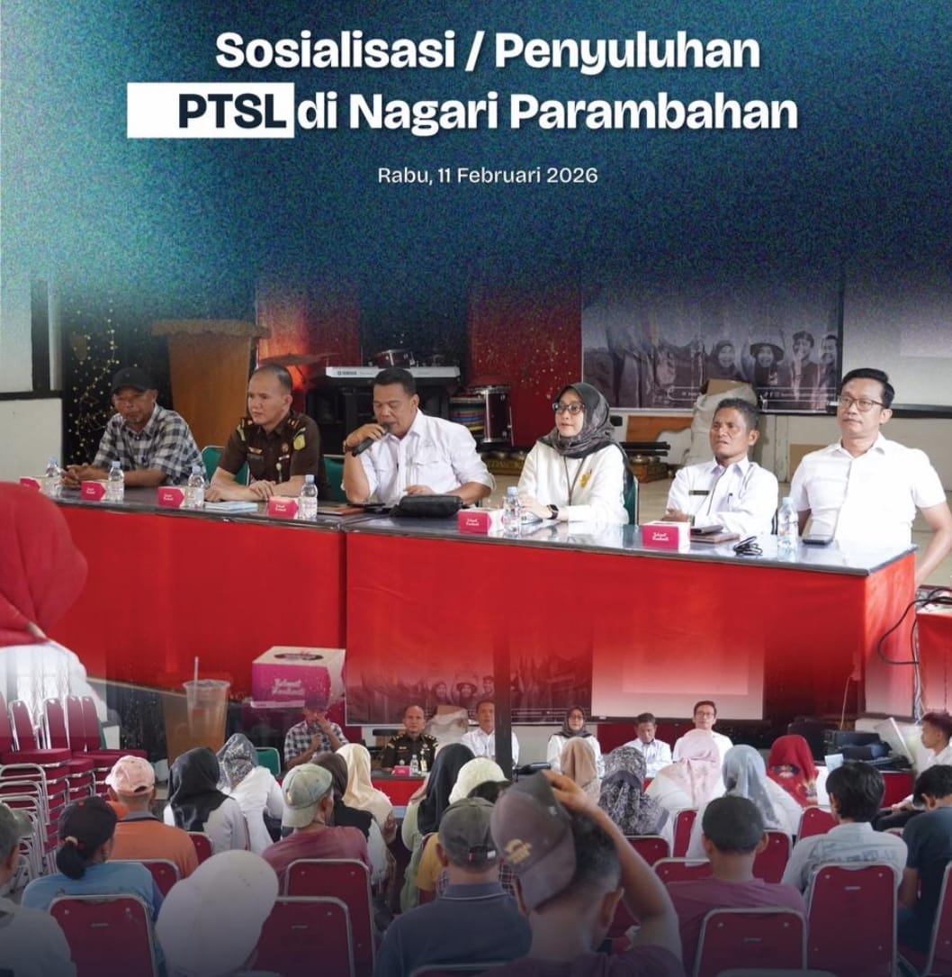 Batusangkar, Jurnal Minang. Guna menyukseskan kegiatan pembuatan sertifikat tanah, pada Rabu, 11 Februari 2026, Kantor Pertanahan Kabupaten Tanah Datar melaksanakan kegiatan penyuluhan Pendaftaran Tanah Sistematis Lengkap (PTSL) di Nagari Parambahan. Kegiatan ini berlangsung di Aula Kantor Wali Nagari Parambahan mulai pukul 09.30 WIB.