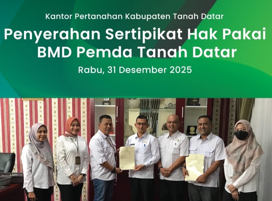 Pagaruyung, Jurnal Minang. Kantor Pertanahan Kabupaten Tanah Datar melaksanakan kegiatan Penyerahan Sertipikat Hak Pakai atas Barang Milik Daerah (BMD) Pemerintah Kabupaten Tanah Datar pada Rabu, 31 Desember 2025. Kegiatan ini merupakan bagian dari komitmen pemerintah dalam mewujudkan tertib administrasi pertanahan serta pengamanan aset milik daerah.
