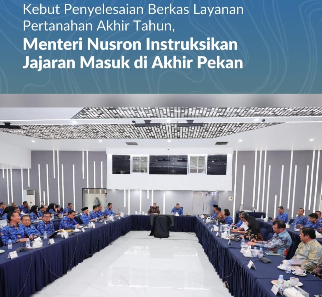 Jakarta, Jurnal Minang. Mengawali bulan terakhir di tahun 2025, Kementerian Agraria dan Tata Ruang/Badan Pertanahan Nasional (ATR/BPN) menggelar Rapat Pimpinan (Rapim) untuk fokus membahas langkah percepatan penyelesaian berkas layanan pertanahan. Menteri ATR/Kepala BPN, Nusron Wahid, menyatakan hal itu jadi perhatian utama kementerian yang perlu disusun langkah luar biasa untuk penuntasan targetnya.