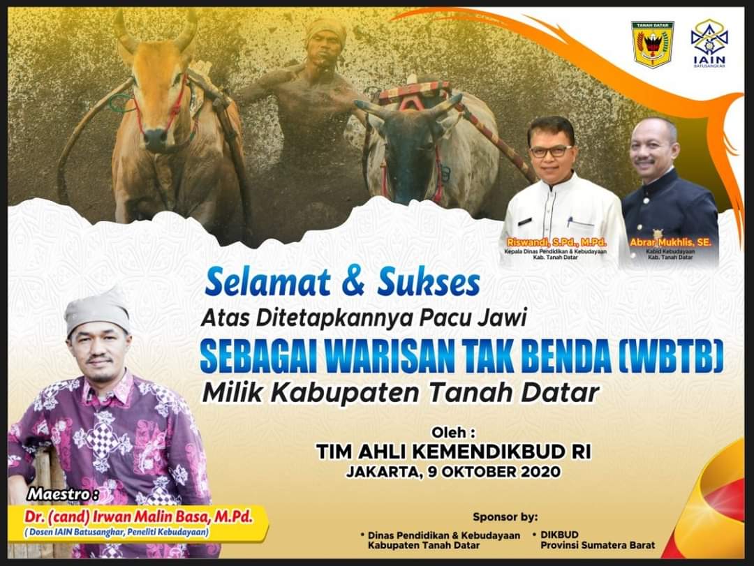 Pacu Jawi disidangkan oleh Tim Ahli Nasional melalui zoom meeting dg maestro pada tgl 7 Oktober 2020. Acara ini dihadiri oleh Kepala Dinas Pendidikan Tanah Datar Riswandi, M.Pd serta Kabid Kebudayaan Abrar Mukhlis, SE. Hadir pula kepala Dinas Kebudayaan Prov Sumbar serta para pejabat lainnya.