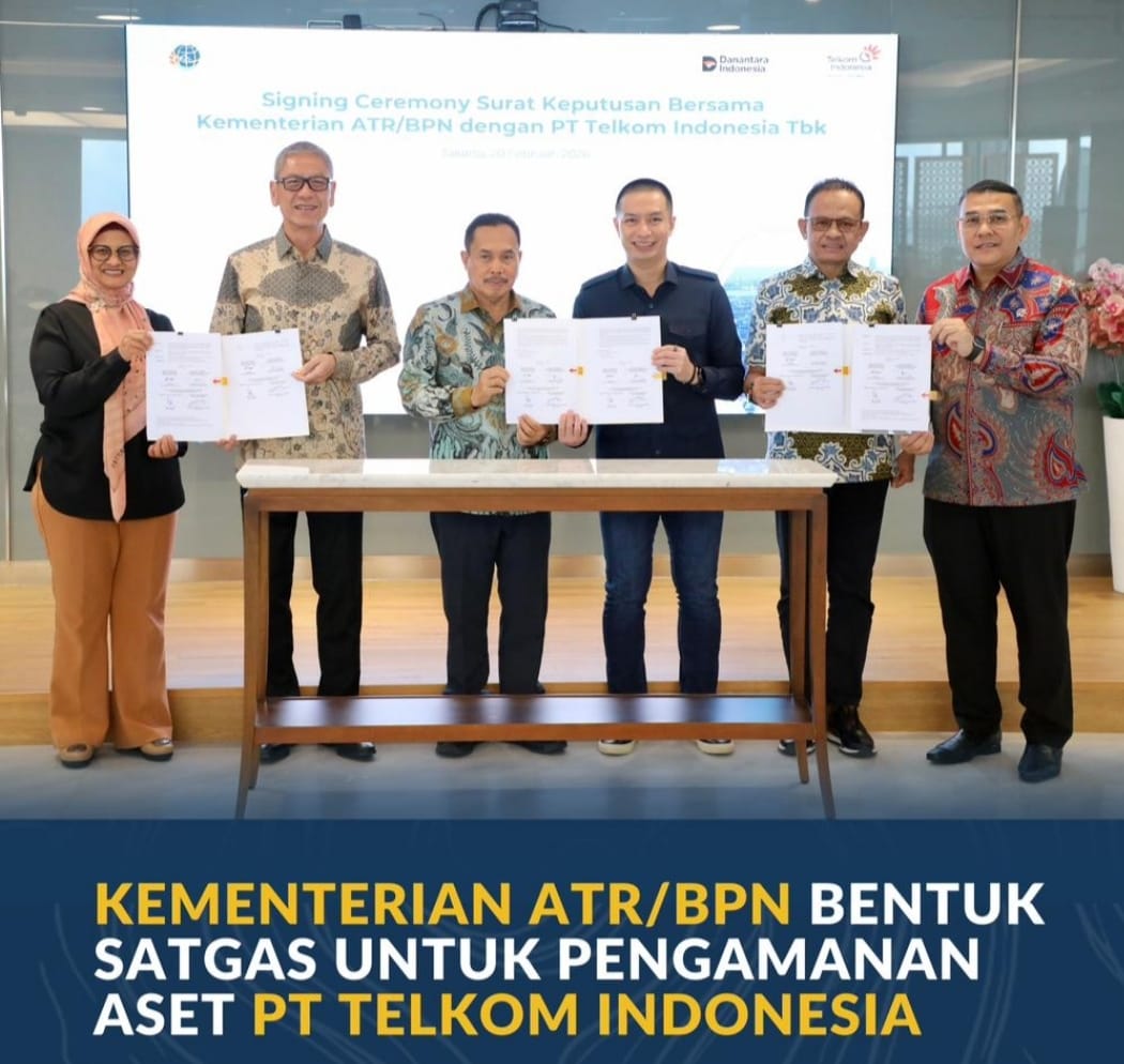 Jakarta, Jurnal Minang. Kementerian Agraria dan Tata Ruang/Badan Pertanahan Nasional (ATR/BPN) bersama PT Telkom Indonesia membentuk Satgas Akselerasi Legalisasi dan Penyelesaian Kasus Aset Tanah Telkom 2026. Pembentukan Satgas disahkan melalui penandatanganan Surat Keputusan Bersama dengan disaksikan oleh Wakil Menteri (Wamen) ATR/Wakil Kepala (Waka) BPN, Ossy Dermawan dan Direktur Utama PT Telkom Indonesia, Dian Siswarini pada Jumat (20/02/2026), di Gedung Telkom Hub, Jakarta.