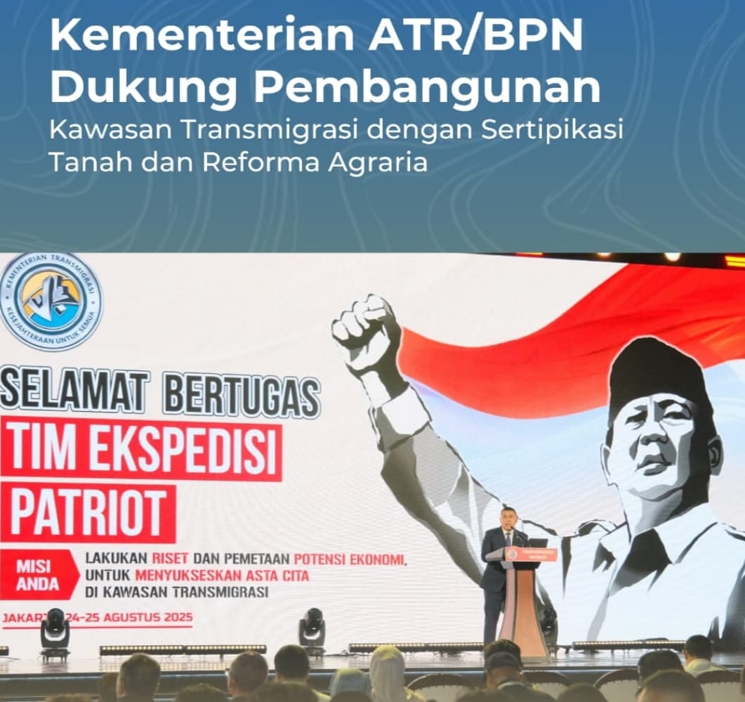 Jakarta, Jurnal Minang. Kementerian Agraria dan Tata Ruang/Badan Pertanahan Nasional (ATR/BPN) ikut mendukung pertumbuhan pembangunan dan ekonomi di kawasan transmigrasi sesuai dengan visi misi Asta Cita melalui beberapa program strategis bersama Kementerian Transmigrasi. Hal ini disampaikan oleh Wakil Menteri (Wamen) ATR/Wakil Kepala (Waka) BPN, Ossy Dermawan, saat menyampaikan materi dalam Pembekalan dan Pelepasan Tim Ekspedisi Patriot, di Balai Kartini, Jakarta, Senin (25/08/2025).