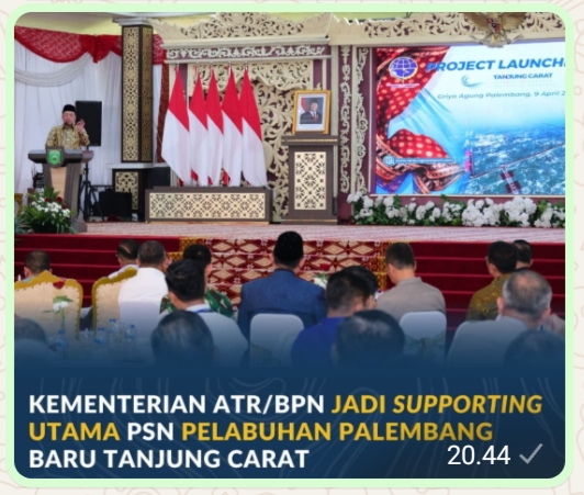 “Kementerian ATR/BPN sebagai supporting utama semua kegiatan investasi, seperti halnya di proyek ini. Proyek investasinya di bidang connectivity, pelabuhan. Diharapkan dengan adanya pelabuhan yang terstandar nanti akan memicu investasi masuk,” ujar Menteri ATR/Kepala BPN, Nusron Wahid dalam Project Launching Pelabuhan Palembang Baru Tanjung Carat, di Griya Agung, Kantor Gubernur Sumatera Selatan, Kota Palembang, Kamis (09/04/2026).