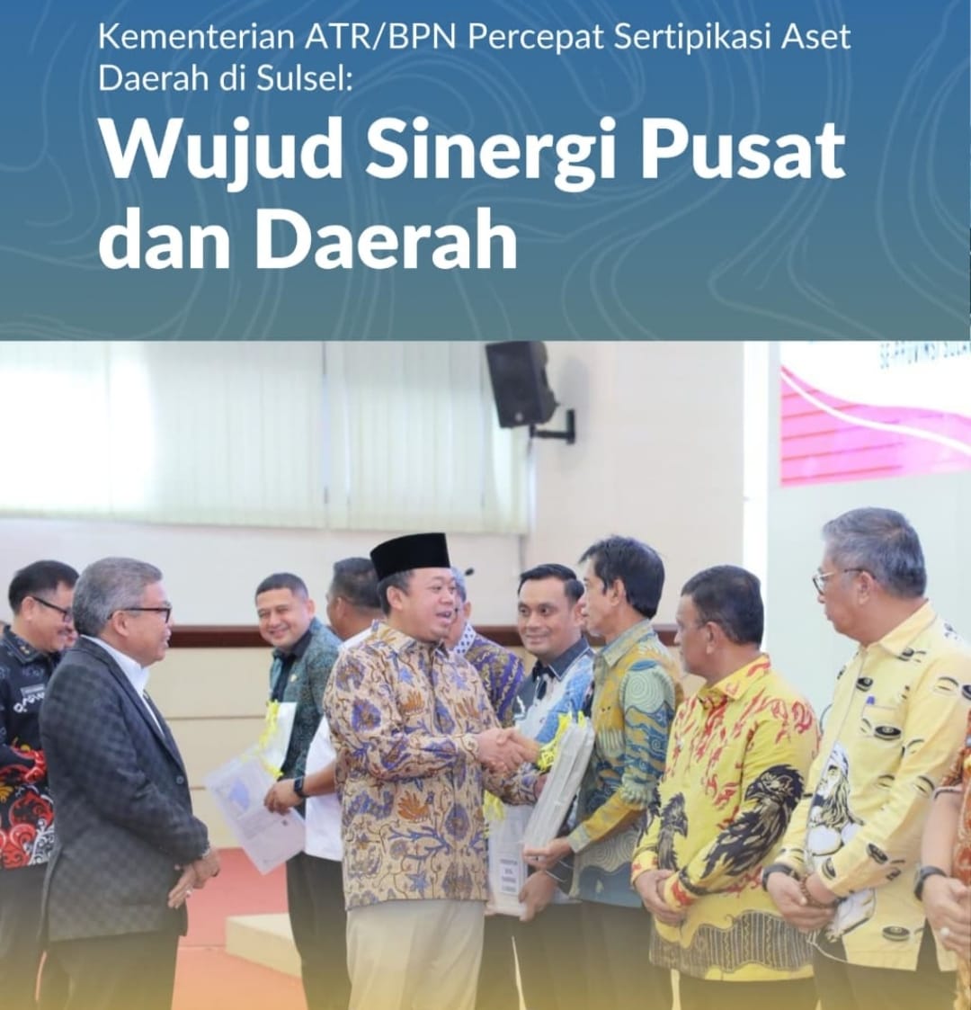 Makassar, Jurnal Minang. Kementerian Agraria dan Tata Ruang/Badan Pertanahan Nasional (ATR/BPN) terus memperkuat sinergi dengan pemerintah daerah dalam percepatan sertipikasi aset milik negara. Dalam kunjungan kerja di Sulawesi Selatan, Kamis (13/11/2025), Menteri ATR/Kepala BPN, Nusron Wahid menyerahkan 254 sertipikat aset kepada kepala daerah di wilayah Sulawesi Selatan. Salah satu daerah yang menerima sertipikat dengan jumlah terbanyak yaitu Pemerintah Kabupaten Pangkajene dan Kepulauan (Pangkep) dengan total 208 sertipikat aset.
