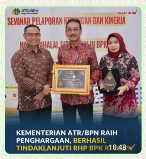 Jakarta, Jurnal Minang. Kementerian Agraria dan Tata Ruang/Badan Pertanahan Nasional (ATR/BPN) melaksanakan Tindak Lanjut Rekomendasi Hasil Pemeriksaan (TLRHP) dari Badan Pemeriksa Keuangan (BPK). Dari hasil tersebut, Kementerian ATR/BPN telah menyelesaikan 90,8% temuan yang berbuah apresiasi berupa penghargaan dari BPK.