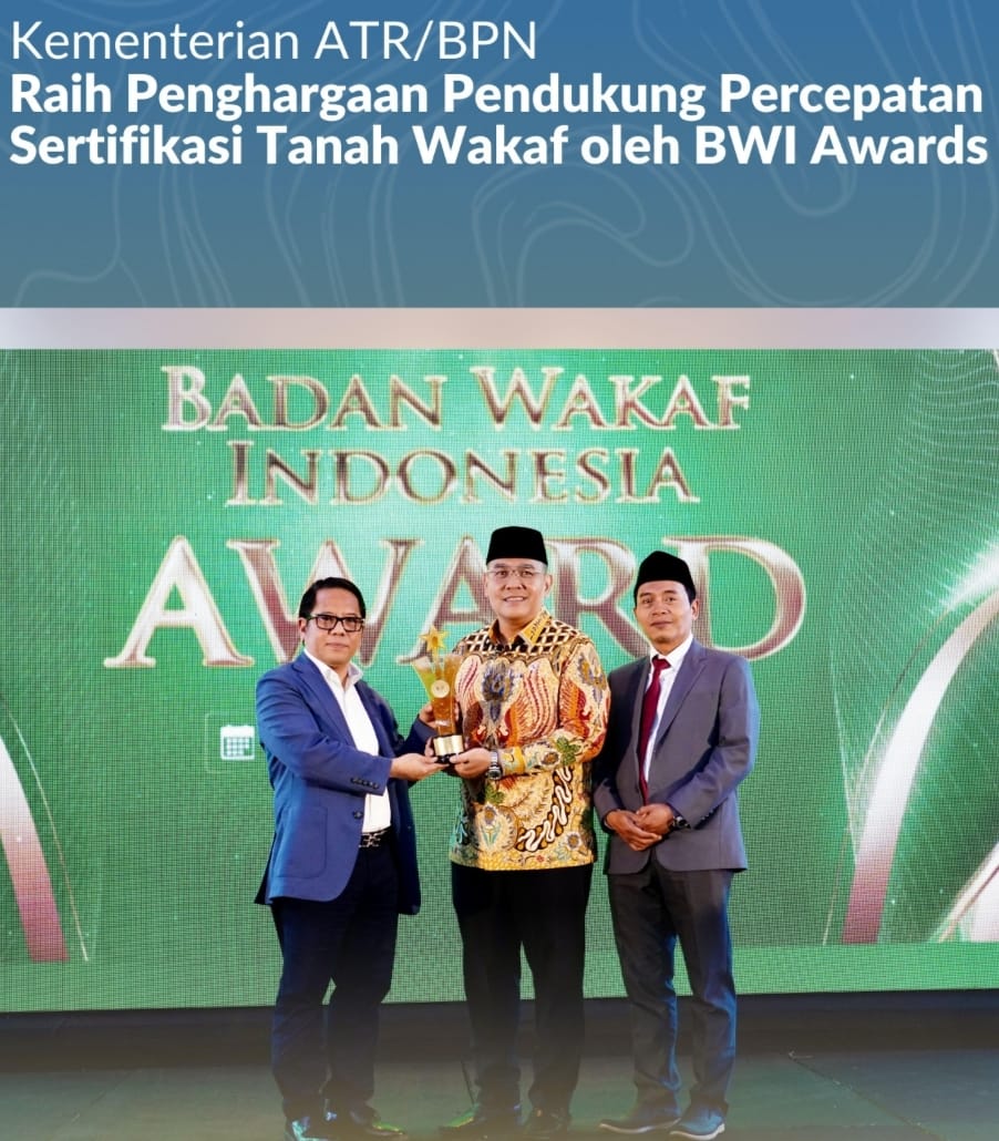 Jakarta , Jurnal Minang.Kementerian Agraria dan Tata Ruang/Badan Pertanahan Nasional (ATR/BPN) mendapatkan penghargaan dalam acara Badan Wakaf Indonesia (BWI) Awards kategori Pendukung Percepatan Sertifikasi Tanah Wakaf oleh BWI. Penerimaan penghargaan ini diwakili oleh Wakil Menteri ATR (Wamen)/Wakil Kepala (Waka) BPN, Ossy Dermawan, di Jakarta, Selasa (05/08/2025).