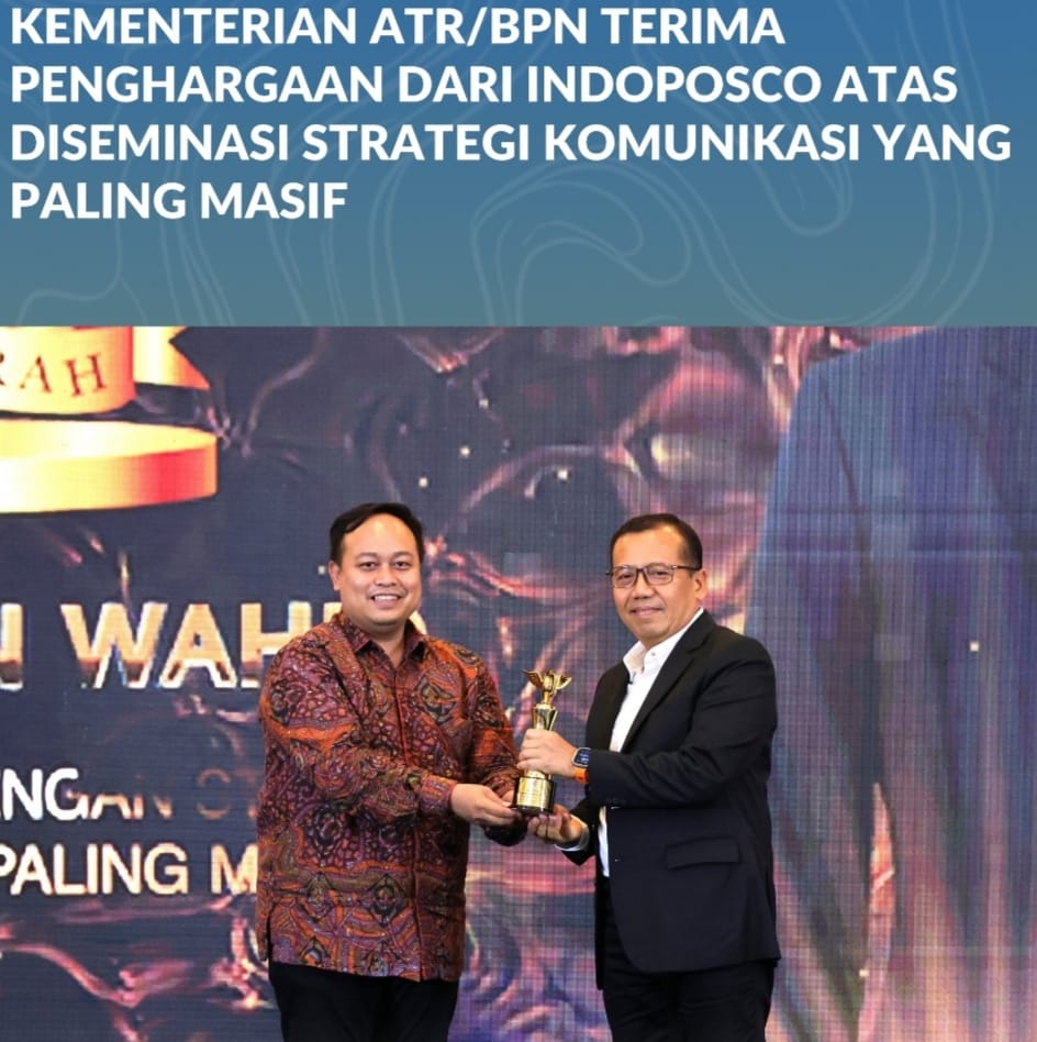 Dalam acara Anugerah INDOPOSCO Tahun 2026, Kementerian ATR/BPN menerima penghargaan bersama 19 pihak lainnya yang dinilai berjasa dalam pembangunan Indonesia. Penghargaan diserahkan langsung oleh Komisaris Utama PT Indonesia Digital Pos, Syarif Hidayatullah, selaku perusahaan yang menaungi INDOPOSCO.