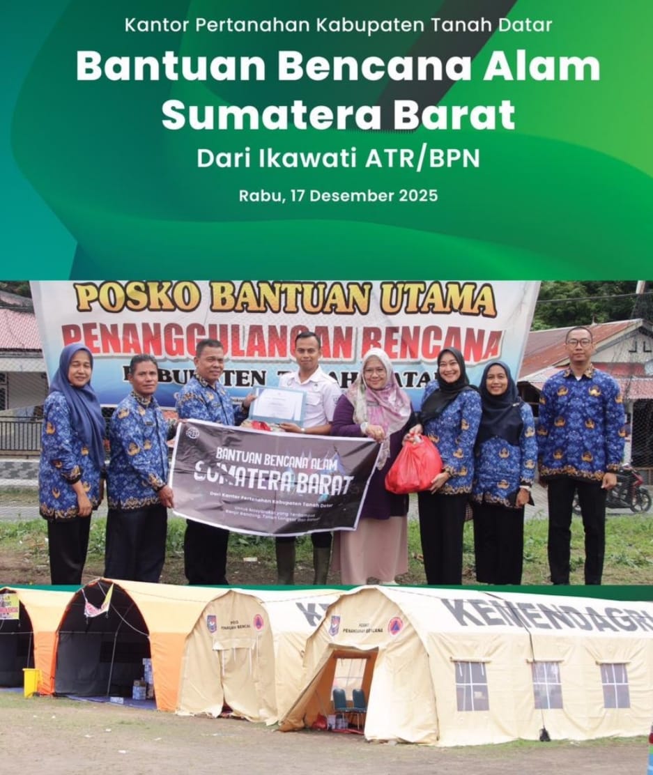 Tanah Datar, Jurnal Minang. Dalam rangka meringankan korban bencana alam banjir bandang atau galodo di Kabupaten Tanah Datar,Pada Rabu, 17 Desember 2025, Kepala Kantor Pertanahan Kabupaten Tanah Datar, Ardinal Yullti, menyerahkan bantuan kemanusiaan dari IKAWATI ATR/BPN kepada masyarakat yang terdampak bencana banjir dan tanah longsor di Kabupaten Tanah Datar.