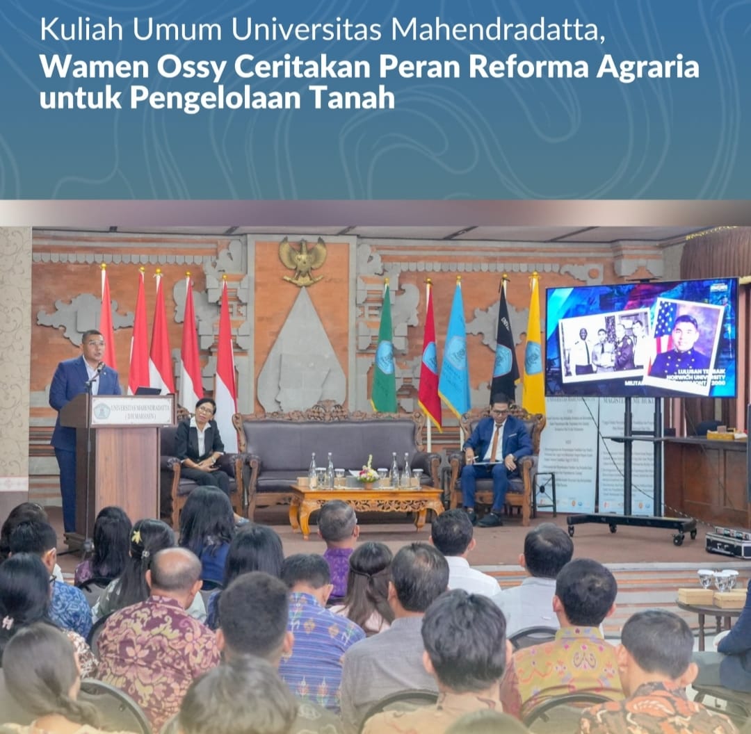 Bali , Jurnal Minang. Wakil Menteri Agraria dan Tata Ruang/Wakil Kepala Badan Pertanahan Nasional (Wamen ATR/Waka BPN), Ossy Dermawan, diundang menjadi pembicara kunci dalam Kuliah Umum yang diselenggarakan Universitas Mahendradatta, di Bali, Sabtu (02/08/2025). Di hadapan mahasiswa yang mengikuti kelas ini, ia menjelaskan soal pentingnya Reforma Agraria sebagai instrumen utama dalam pengelolaan tanah yang adil di Indonesia.