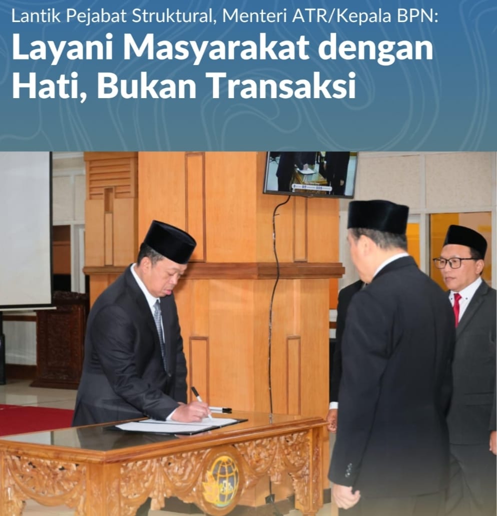 Semarang, Jurnal Minang. Menteri Agraria dan Tata Ruang/Kepala Badan Pertanahan Nasional (ATR/BPN), Nusron Wahid, melantik 24 Pejabat Struktural di lingkungan Kementerian ATR/BPN, Jumat (12/09/2025). Para pejabat yang dilantik diingatkan oleh Menteri Nusron untuk menjalani tugas melayani dengan hati dan mendedikasikan diri kepada masyarakat.