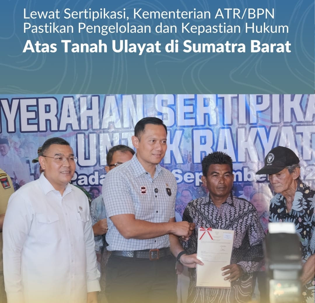 Padang, Jurnal Minang. Kementerian Agraria dan Tata Ruang/Badan Pertanahan Nasional (ATR/BPN) melakukan penghormatan kepada tanah ulayat di Indonesia melalui sertipikasi tanah ulayat/tanah masyarakat hukum adat. Hal ini disampaikan oleh Wakil Menteri (Wamen) ATR/Wakil Kepala (Waka) BPN, Ossy Dermawan, pada kegiatan Penyerahan Sertipikat Tanah untuk Rakyat, di Kerapatan Adat Nagari (KAN) Kuranji, Kota Padang, Selasa (30/09/2025).