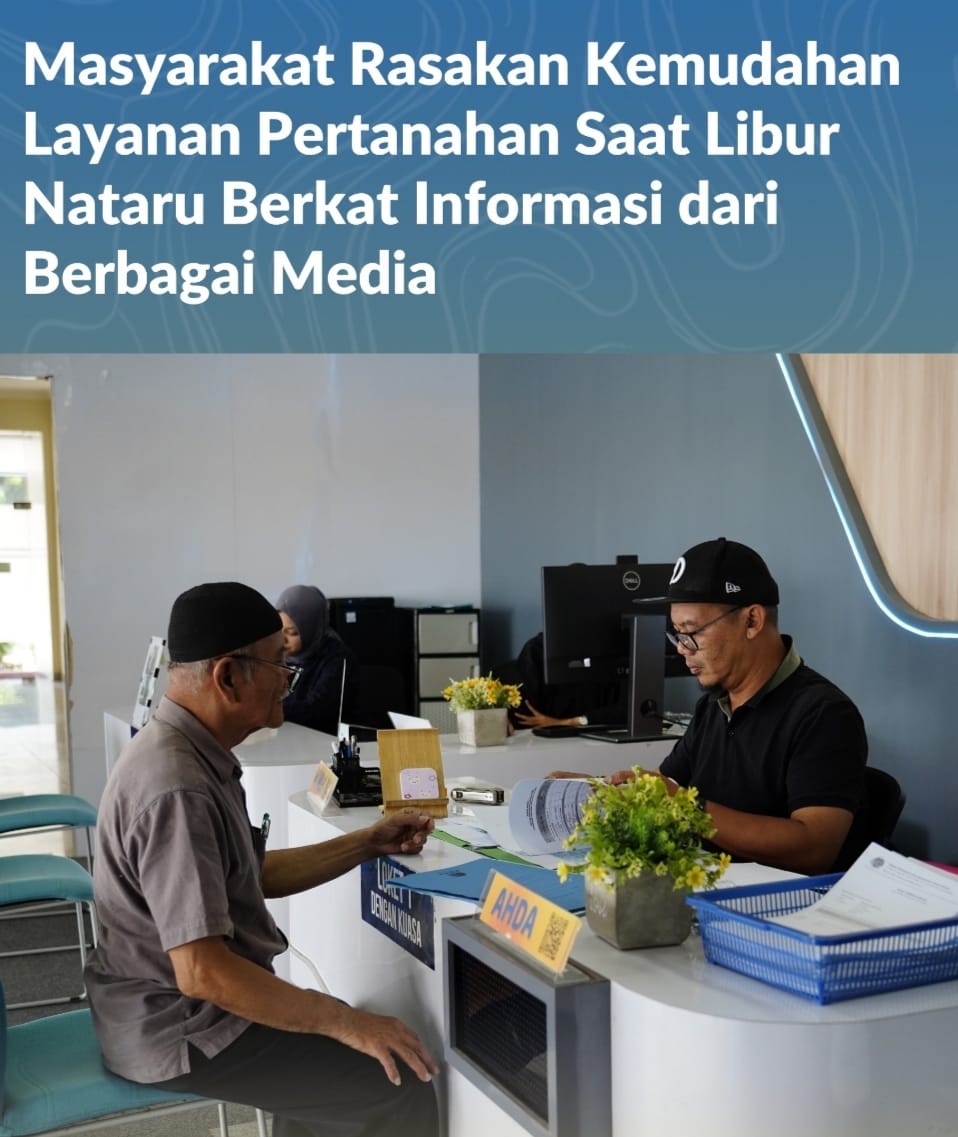 Jakarta, Jurnal Minang. Masyarakat memanfaatkan layanan pertanahan yang tetap dibuka Kementerian Agraria dan Tata Ruang/Badan Pertanahan Nasional (ATR/BPN) selama libur Natal dan tahun baru (Nataru) setelah memperoleh informasi dari berbagai media publik. Layanan pertanahan meski terbatas ini dirasa masyarakat tidak berbeda dengan pelayanan Kantor Pertanahan pada hari kerja normal.