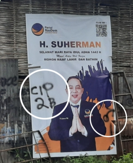 Kita ambil sebuah contoh baliho seorang bakal calon dari partai Nasdem yaitu Suherman. Baliho ini sudah terpasang beberapa hari di pinggir jalan raya Simabur di sebuah bangunan tua. Namun setelah beberapa hari, terlihat coretan di baliho tersebut yang bertuliskan ‘Cip 2 B.’ Apa artinya?
