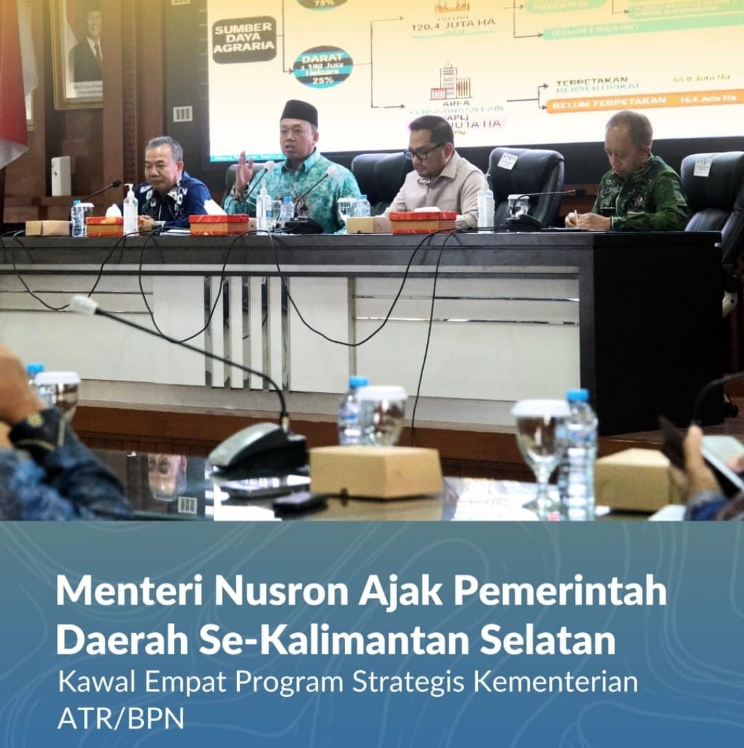 Banjarbaru, Jurnal Minang. Menteri Agraria dan Tata Ruang/Kepala Badan Pertanahan Nasional (ATR/BPN), Nusron Wahid, menegaskan pentingnya sinergi antara pemerintah pusat dan daerah dalam pelaksanaan program Kementerian ATR/BPN. Saat Rapat Koordinasi Pemerintah Daerah se-Kalimantan Selatan, Kamis (31/07/2025), ia menyatakan bahwa keberhasilan kebijakan pertanahan dan penataan ruang sangat bergantung pada dukungan dan kesiapan daerah.