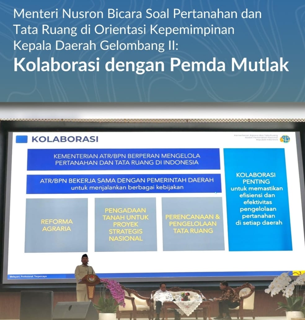 Sumedang, Jurnal Minang. Menteri Agraria dan Tata Ruang/Kepala Badan Pertanahan Nasional (ATR/BPN), Nusron Wahid, memberikan pengarahan dalam Orientasi Kepemimpinan Kepala Daerah dan Wakil Kepala Daerah Tahun 2025 Gelombang II, yang berlangsung di Balairung Rudini, Institut Pemerintahan Dalam Negeri (IPDN), Sumedang, Jawa Barat, Rabu (25/06/2025). Dalam arahannya, ia menekankan bahwa kolaborasi dengan kepala daerah merupakan hal mutlak untuk menyukseskan program strategis nasional dalam bidang pertanahan dan tata ruang.