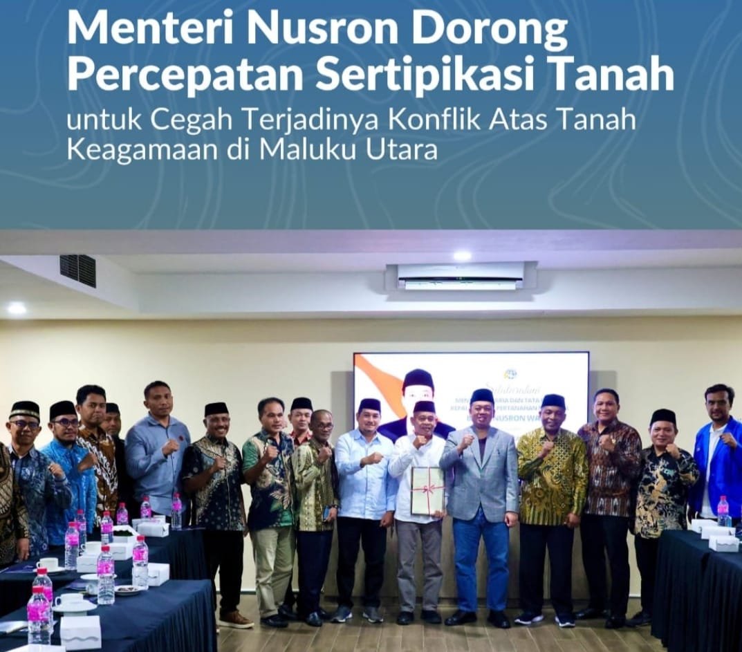 Maluku Utara, Jurnal Minang. Menteri Agraria dan Tata Ruang/Kepala Badan Pertanahan Nasional (ATR/BPN), Nusron Wahid, ingin mempercepat sertipikasi tanah di Indonesia, termasuk tanah tempat masyarakat beribadah dan milik organisasi keagamaan. Tanah yang sudah bersertipikat bisa meminimalisir bahkan mencegah terjadinya konflik pertanahan.