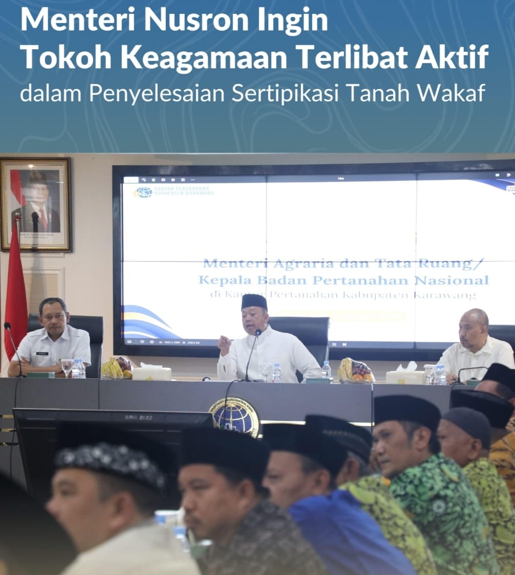 Karawang , Jurnal Minang. Upaya penyelesaian sertipikasi tanah wakaf dan rumah ibadah di Indonesia terus diperkuat melalui peningkatan peran strategis tokoh keagamaan. Menteri Agraria dan Tata Ruang/Kepala Badan Pertanahan Nasional (ATR/BPN), Nusron Wahid, menegaskan pentingnya membangun kesadaran sekaligus mendorong partisipasi aktif para tokoh agama guna mempercepat sertipikasi aset rumah ibadah.