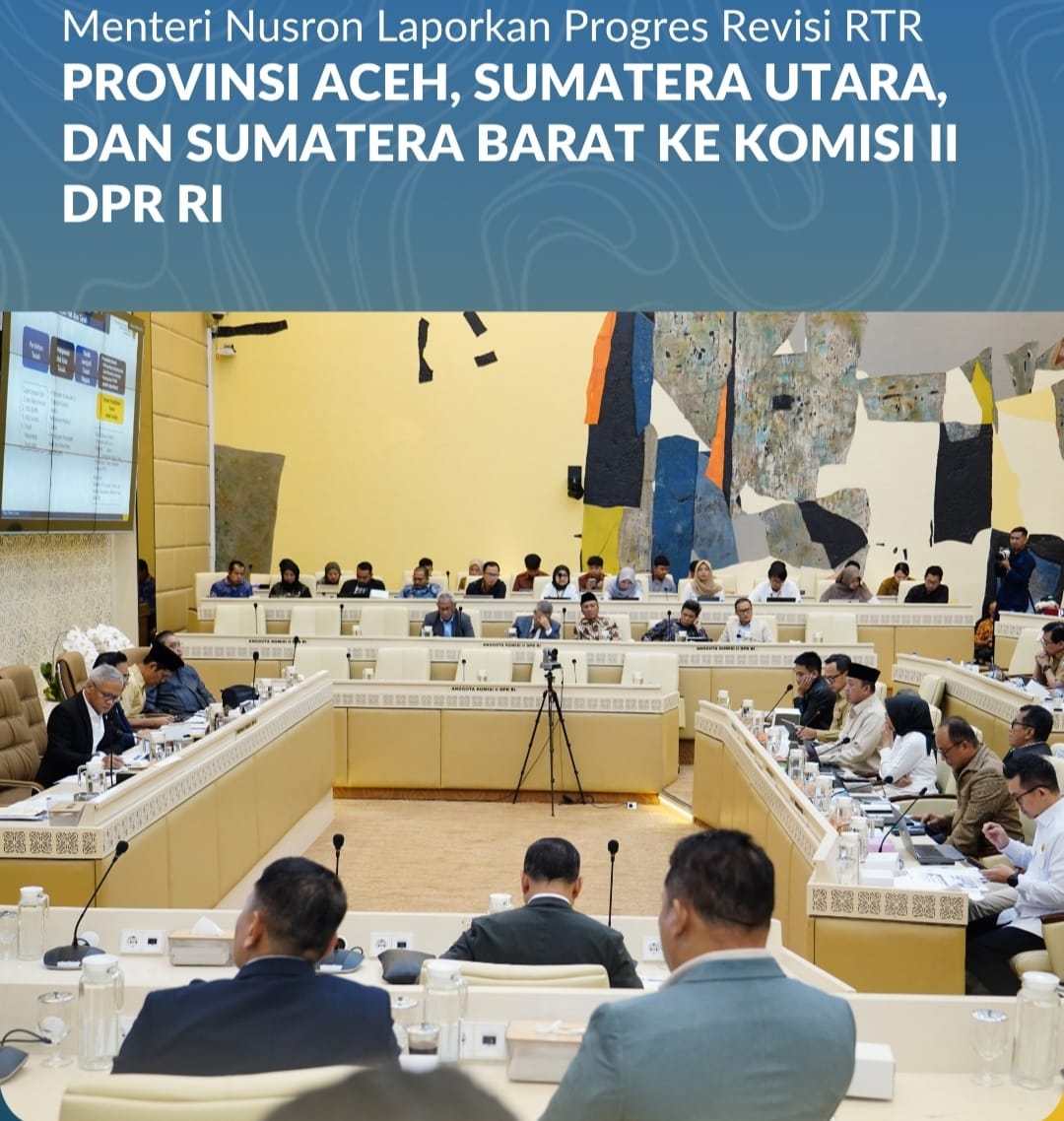 Jakarta, Jurnal Minang. Menteri Agraria dan Tata Ruang/Kepala Badan Pertanahan Nasional (ATR/BPN), Nusron Wahid, melaporkan perkembangan penyusunan dan revisi Rencana Tata Ruang (RTR) di Pulau Sumatera, khususnya di Provinsi Aceh, Sumatera Utara, dan Sumatera Barat dalam Rapat Kerja (Raker) dan Rapat Dengar Pendapat (RDP) bersama Komisi II DPR RI yang digelar di Gedung Nusantara DPR RI, Jakarta, Senin (19/01/2026). Ia menjelaskan bahwa revisi RTR Kawasan Strategis Pulau Sumatera hingga kini masih menunggu proses penetapan dari Kementerian Sekretariat Negara (Kemensetneg).