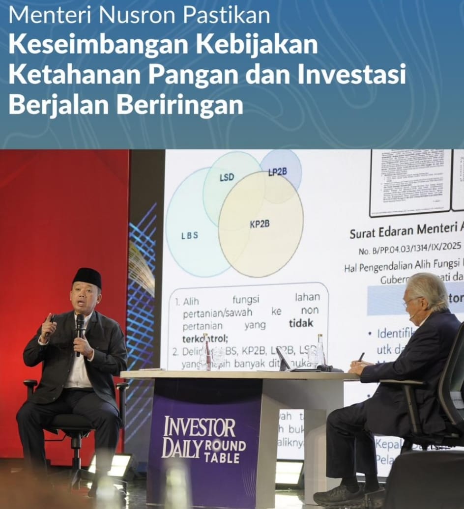 Jakarta, Jurnal Minang. Menteri Agraria dan Tata Ruang/Kepala Badan Pertanahan Nasional (ATR/BPN), Nusron Wahid, menyatakan bahwa upaya menjaga ketahanan pangan nasional tidak akan menghambat iklim investasi. Menurutnya, kedua agenda tersebut harus berjalan beriringan demi memastikan pembangunan dan masa depan bangsa tetap berkelanjutan. Demikian ia sampaikan saat menjadi narasumber dalam acara Investor Daily Roundtable, yang digelar di Jakarta, Rabu (10/12/2025).