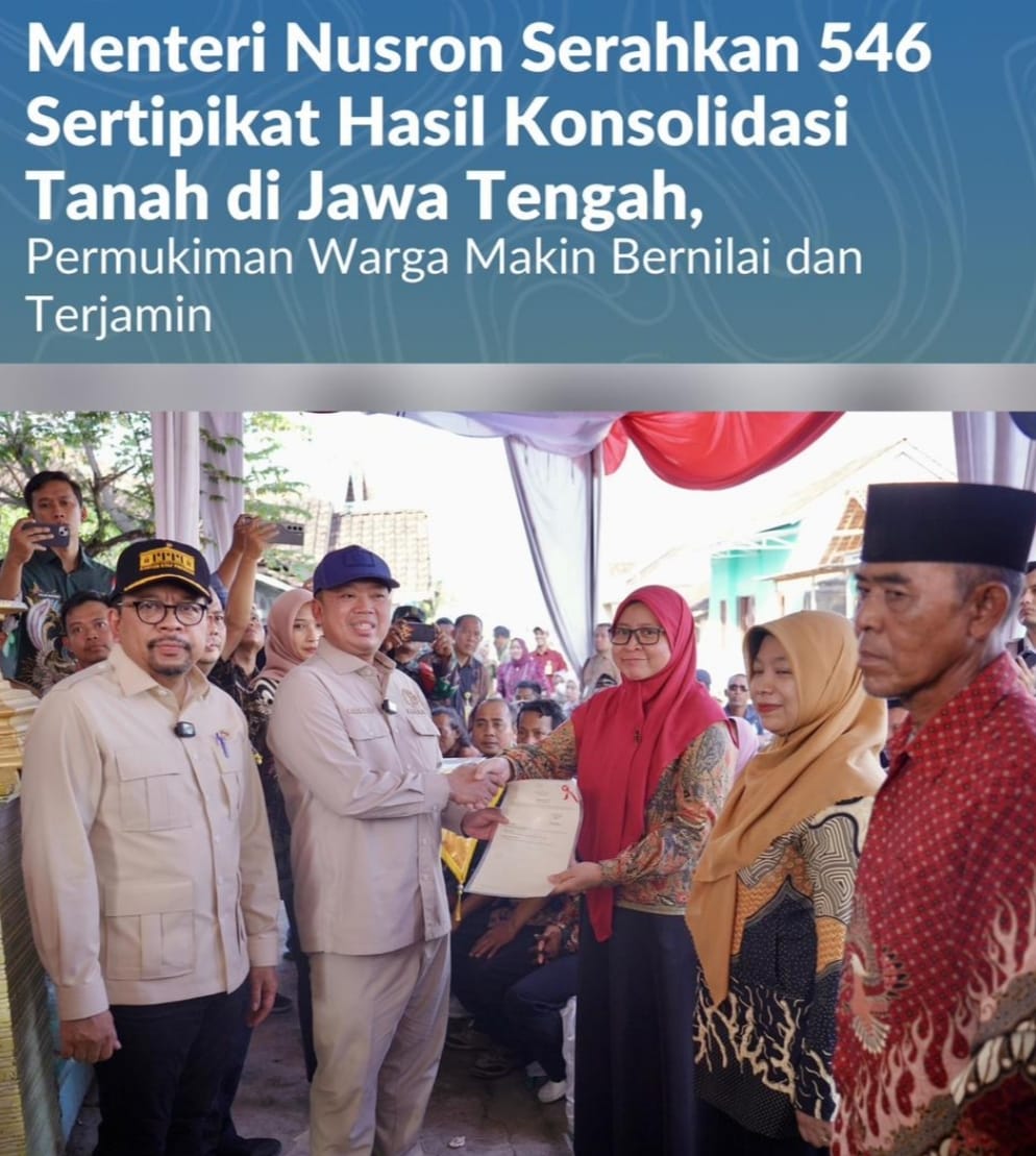 Kendal, Jurnal Minang. Menteri Agraria dan Tata Ruang/Kepala Badan Pertanahan Nasional (ATR/BPN), Nusron Wahid, menyerahkan 546 sertipikat hasil program Konsolidasi Tanah di tiga kabupaten/kota di Provinsi Jawa Tengah pada Selasa (02/12/2025). Penyerahan sertipikat ini mencakup masyarakat penerima di Kabupaten Kendal, Kota Pekalongan, dan Kabupaten Semarang.