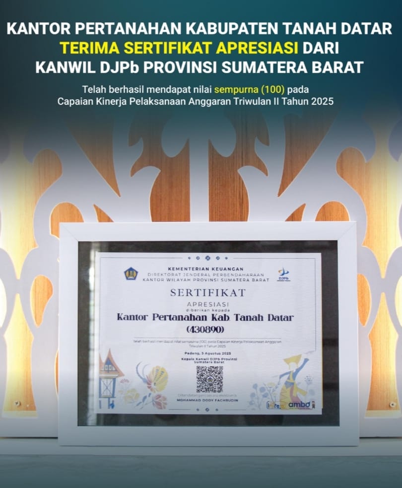 Tanah Datar, Jurnal Minang. Prestasi membanggakan kembali ditorehkan oleh Kantor Pertanahan Kabupaten Tanah Datar. Pada capaian kinerja pelaksanaan anggaran Indikator Kinerja Pelaksanaan Anggaran (IKPA) Triwulan II Tahun 2025, Kantor Pertanahan Kabupaten Tanah Datar berhasil meraih nilai sempurna, 100, sehingga mendapatkan penghargaan dari Direktorat Jenderal Perbendaharaan Kementerian Keuangan Kantor Wilayah Provinsi Sumatera Barat.