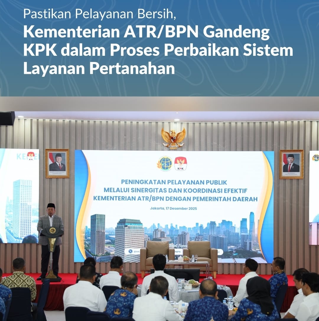 Jakarta, Jurnal Minang. Kementerian Agraria dan Tata Ruang/Badan Pertanahan Nasional (ATR/BPN) memperkuat upaya pencegahan korupsi di bidang pertanahan melalui Sosialisasi bersama Komisi Pemberantasan Korupsi (KPK). Saat membuka sosialisasi pada Rabu (17/12/2025), Menteri ATR/Kepala BPN, Nusron Wahid, menyoroti pentingnya peranan KPK untuk mendeteksi celah di sistem pelayanan pertanahan yang sedang dalam proses transformasi.
