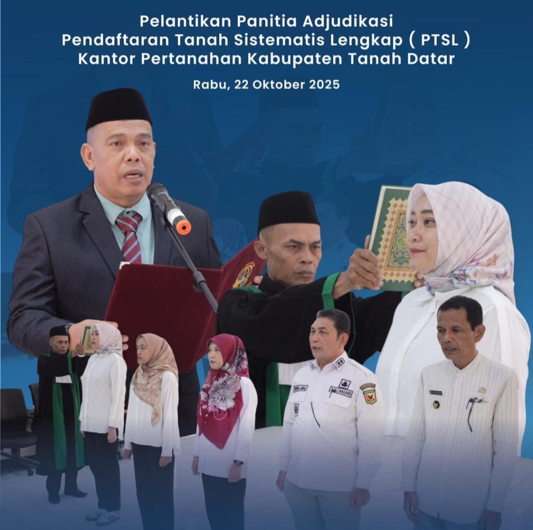 Batusangkar, Jurnal Minang. Dalam rangka menyukseskan kegiatan Pertanahan, Kantor Pertanahan Kabupaten Tanah Datar, Rabu 22 Oktober 2025 melaksanakan kegiatan Pelantikan dan Pengambilan Sumpah Panitia Adjudikasi Pendaftaran Tanah Sistematis Lengkap (PTSL) Tahun 2025 bertempat di Aula Kantor Pertanahan Kabupaten Tanah Datar.