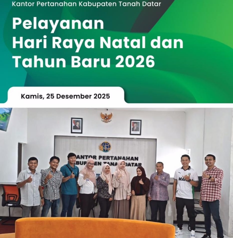 Pagaruyung, Jurnal Minang. Kantor Pertanahan Kabupaten Tanah Datar tetap memberikan pelayanan pertanahan kepada masyarakat pada Hari Raya Natal 2025 dan menyambut Tahun Baru 2026. Pelayanan dilaksanakan pada Kamis, 25 Desember 2025 dengan penyesuaian jam operasional.