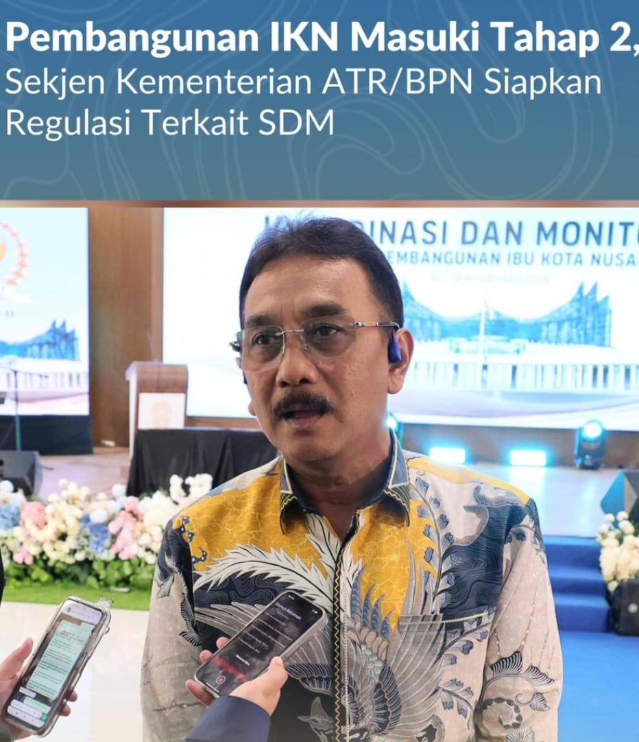 IKN, Jurnal Minang. Sekretaris Jenderal (Sekjen) Kementerian Agraria dan Tata Ruang/Badan Pertanahan Nasional (ATR/BPN), Dalu Agung Darmawan, mengikuti Rapat Koordinasi dan Monitoring Capaian Pembangunan Tahap 1 dan 2 IKN, di Kantor Kemenko 3, IKN, Selasa (11/11/2025). Pada kesempatan tersebut, ia menyatakan bahwa Kementerian ATR/BPN siap mendukung progres pembangunan IKN dari sisi tata kelola pemerintahan serta aspek kelembagaan.