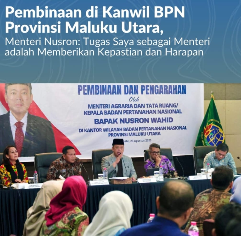 Maluku Utara, Jurnal Minang. Menteri Agraria dan Tata Ruang/Kepala Badan Pertanahan Nasional (ATR/BPN), Nusron Wahid, memberikan pembinaan kepada jajaran Kantor Wilayah (Kanwil) BPN Provinsi Maluku Utara, di Kota Ternate, Sabtu (23/08/2025). Dalam arahannya, ia menekankan pentingnya jalur pengembangan karier (career path) dan motivasi kerja bagi seluruh jajaran, terutama generasi muda, agar semangat transformasi kelembagaan dapat terus terjaga.