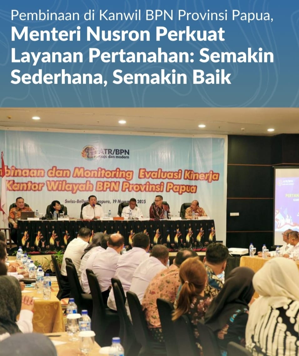 Jayapura, Jurnal Minang. Menteri Agraria dan Tata Ruang/Kepala Badan Pertanahan Nasional (ATR/BPN), Nusron Wahid, mendorong jajaran Kantor Wilayah (Kanwil) BPN Provinsi Papua untuk terus menguatkan kualitas pelayanan pertanahan. Di depan jajaran BPN se-Papua, Menteri Nusron mengingatkan kembali dasar pelayanan yang perlu dijadikan pedoman.