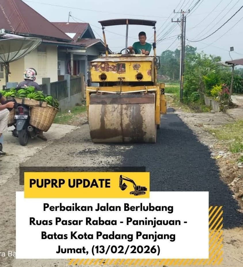 Tanah Datar, Jurnal Minang. Dalam rangka memberikan kenyamanan bagi pengendara roda empat dan roda dua di Kecamatan Batipuh Pemerintah Kabupaten Tanah Datar melalui Bidang Bina Marga Dinas PUPRP melaksanakan kegiatan perbaikan jalan berlubang pada ruas Pasar Rabaa – Paninjauan hingga batas Kota Padang Panjang Nagari Paninjauan Kec. Batipuh, Jumat, (13/02/2026).