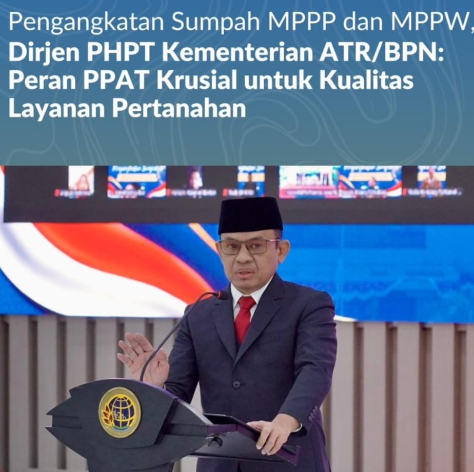 Jakarta, Jurnal Minang. Kementerian Agraria dan Tata Ruang/Badan Pertanahan Nasional (ATR/BPN) menggelar Pengangkatan Sumpah Majelis Pembina dan Pengawas Pejabat Pembuat Akta Tanah (PPAT) Pusat (MPPP) dan Majelis Pembina dan Pengawas PPAT Wilayah (MPPW), di Aula Prona, Kementerian ATR/BPN, pada Senin (12/01/2026). Pengangkatan sumpah tersebut dipimpin oleh Direktur Jenderal Penetapan Hak dan Pendaftaran Tanah (Dirjen PHPT), Asnaedi.