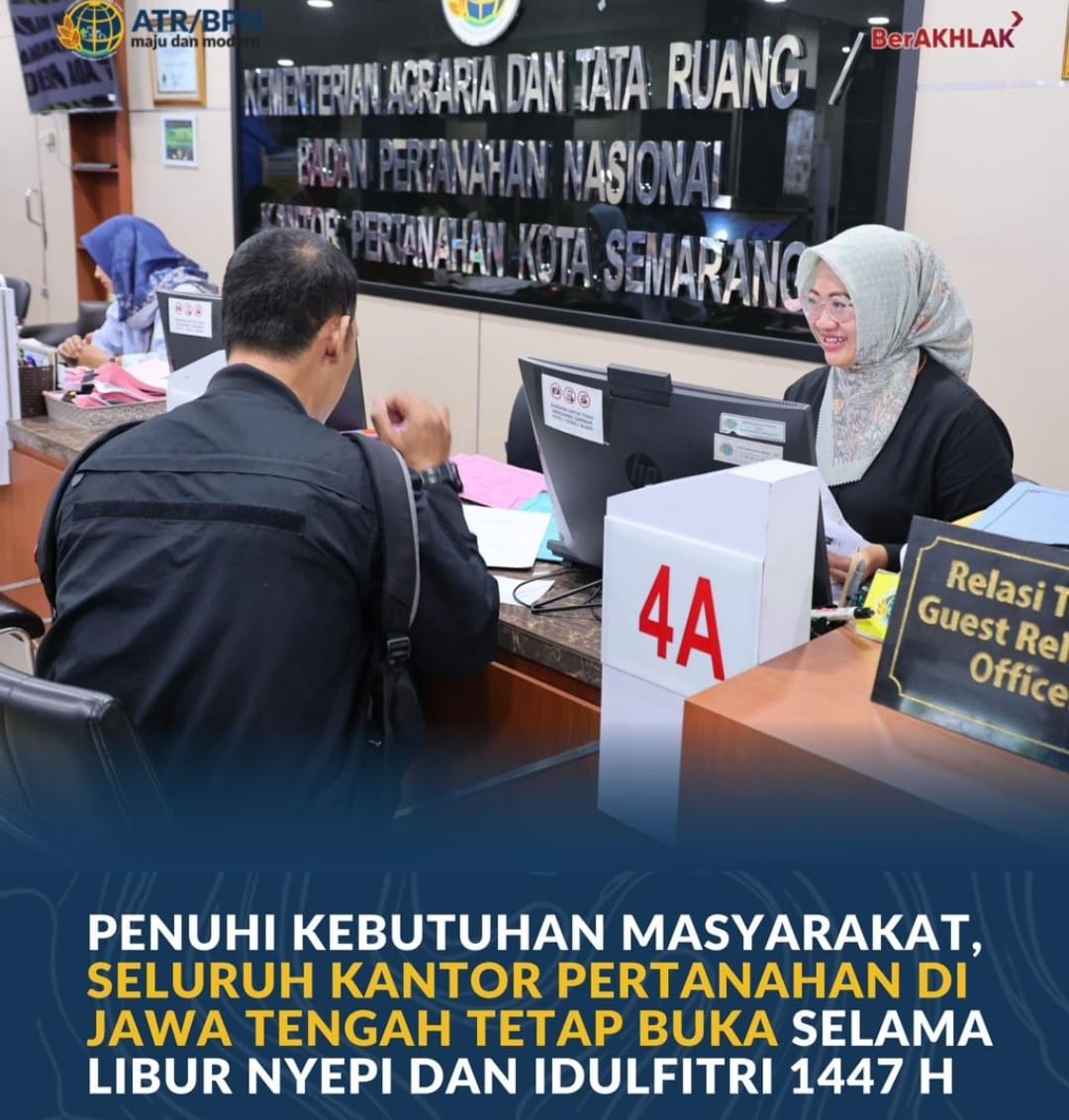 Semarang, Jurnal Minang. Masyarakat di Jawa Tengah tetap bisa mengurus keperluan pertanahan tanpa harus menunggu libur Hari Raya Nyepi dan Idulfitri 1447 H berakhir. Seluruh Kantor Pertanahan yang ada di Jawa Tengah membuka pelayanan terbatas untuk memastikan akses layanan tetap tersedia bagi masyarakat yang membutuhkan di tengah libur nasional dan cuti bersama yang cukup panjang.
